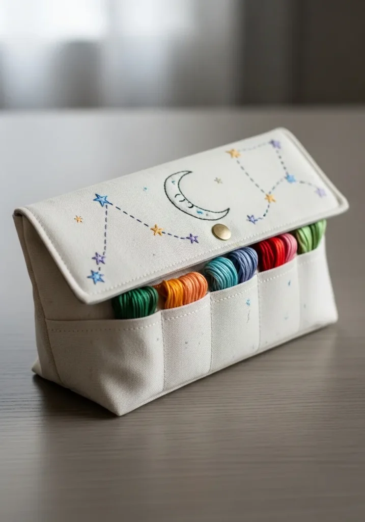 This sweet little organizer looks like a tiny fabric house sitting on a craft table. The soft beige fabric gives it a cozy handmade feel, while the stitched lid features delicate embroidery with small stars and a moon. Inside the open box, neat rows of colorful embroidery floss peek out in bright shades like orange, green, blue, and red. The compartments keep every thread roll snug and visible, which makes the whole setup look tidy and charming.