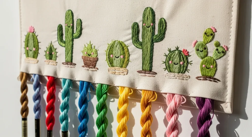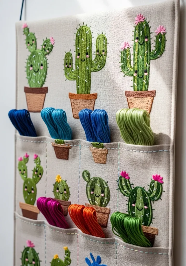 This bright wall organizer features rows of stitched fabric pockets decorated with adorable embroidered cactus plants in tiny terracotta pots. Each pocket holds neatly arranged bundles of embroidery floss in bold colors like teal, orange, and deep pink. The playful cactus design brings a fun desert vibe to the craft room wall.