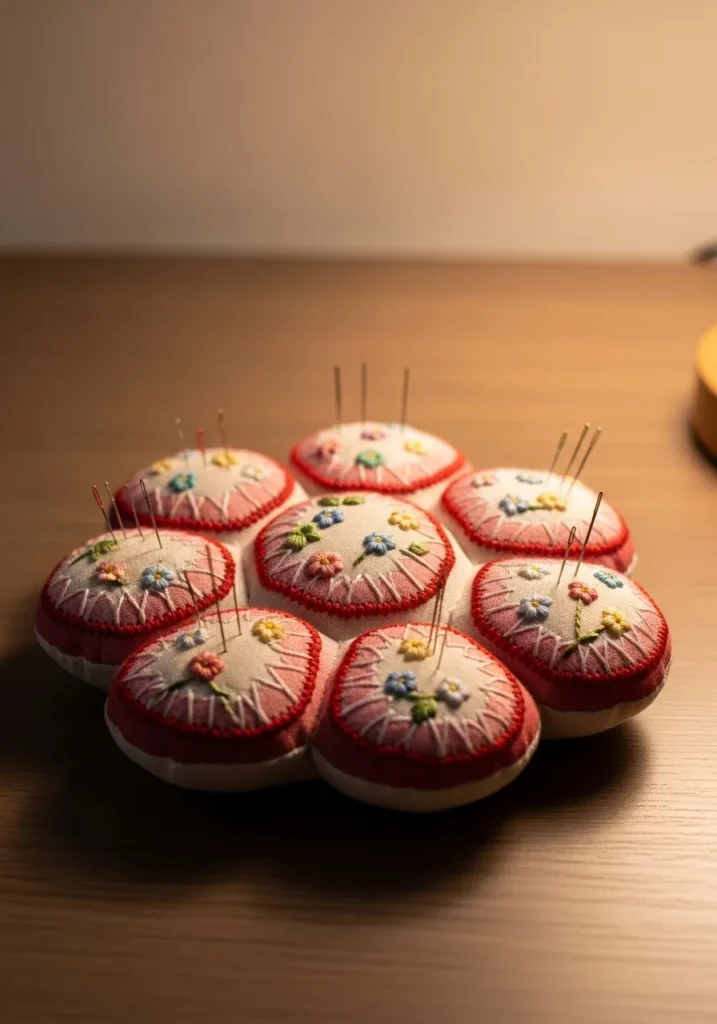 This adorable set of pin cushions looks like a plate of tiny donuts sitting on the craft table. Each round cushion is wrapped in soft fabric with colorful embroidered sprinkles and stitched icing patterns. Sewing pins stick neatly into the fluffy tops, creating a playful and practical little collection.