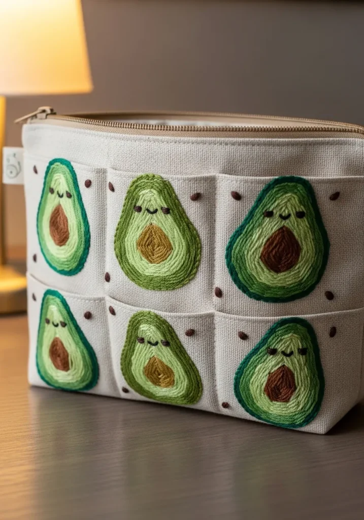 This cute zipper pouch is covered with embroidered avocado halves arranged in neat rows across soft cream fabric. Each avocado shows its rich green layers and a warm brown seed stitched right in the center. The pouch shape keeps embroidery supplies tucked safely inside while the playful fruit pattern adds a cozy and modern look.