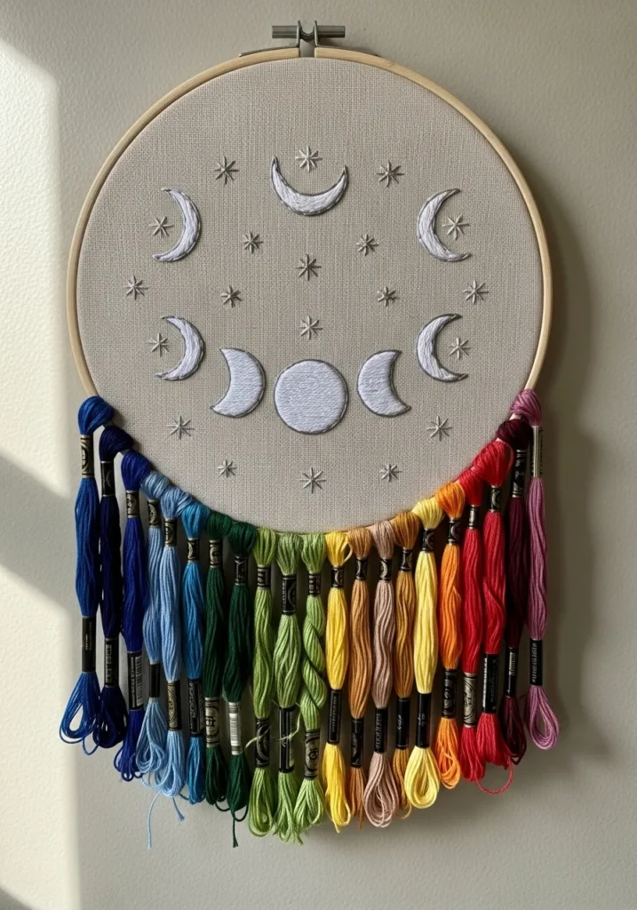 This dreamy embroidery hoop features delicate stitched moon phases arranged in a circular pattern across natural linen fabric. Small stars sparkle between the moons, creating a calm night sky theme. Along the bottom edge of the hoop, rows of embroidery floss hang neatly in a rainbow of colors that gently sway like a decorative fringe.