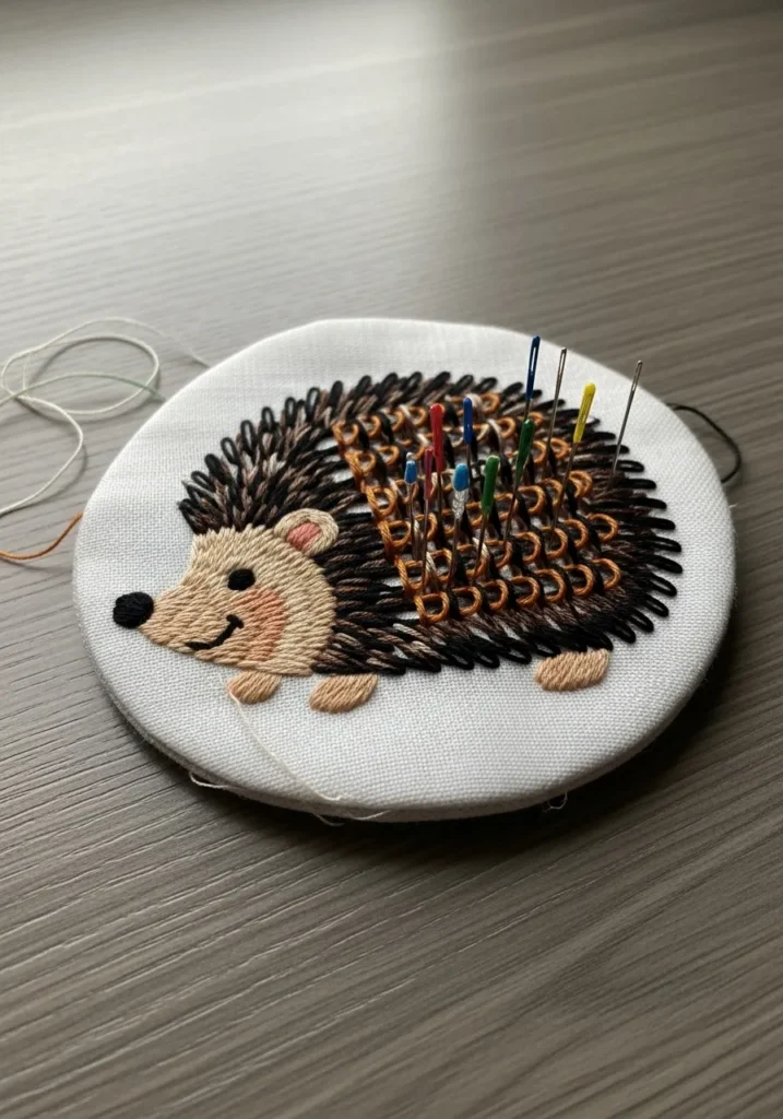 This adorable round cushion shows a tiny embroidered hedgehog resting in the center of soft white fabric. The hedgehog’s back is covered with rows of pins that look like little quills, creating a clever and useful storage space for sewing needles. Around the edges, colorful thread wraps neatly around the cushion to keep small lengths organized.