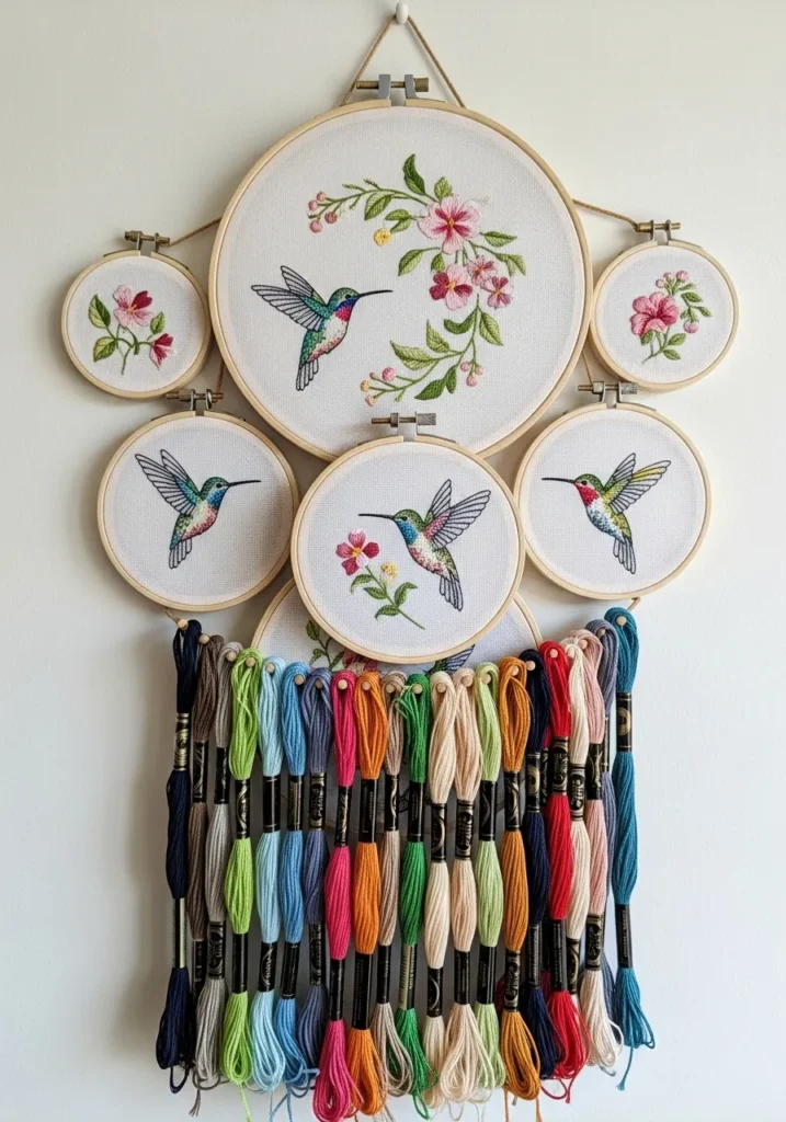 This decorative wall piece uses several embroidery hoops arranged together in a lovely cluster. Each hoop features delicate floral and hummingbird embroidery stitched in soft pinks, greens, and warm coral tones. Beneath the hoops hang bundles of embroidery floss in coordinated colors, creating a colorful fringe that doubles as easy to reach thread storage.