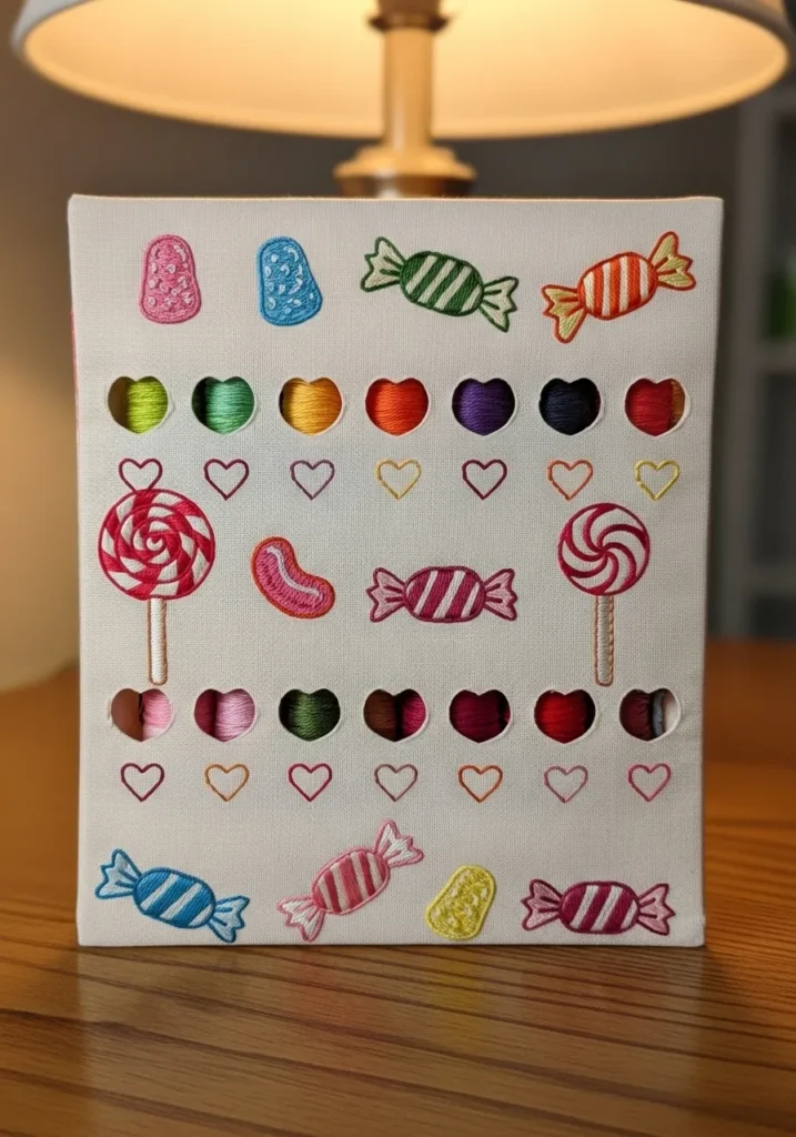 This playful organizer board is covered in embroidered candy shapes like lollipops, wrapped sweets, and tiny heart treats stitched in bright cheerful colors. Small hooks or loops across the board hold embroidery floss bundles in matching shades. The white background keeps the design looking fresh while the colorful candy details add a fun pop.