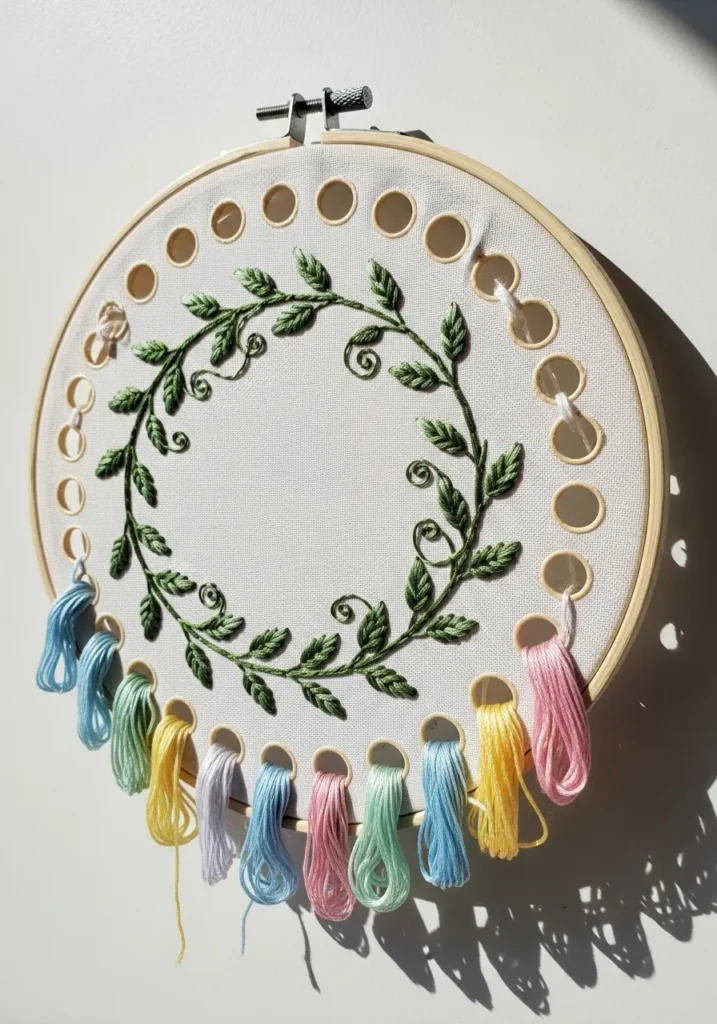 This elegant embroidery hoop organizer features a delicate stitched wreath made from soft green leaves arranged in a circle across natural linen fabric. Around the outer edge of the hoop are small evenly spaced holes where embroidery floss bundles hang neatly in gentle pastel shades like blush pink, pale yellow, mint green, and soft blue. The design feels airy and balanced, with the leafy wreath giving the whole piece a calm botanical look.