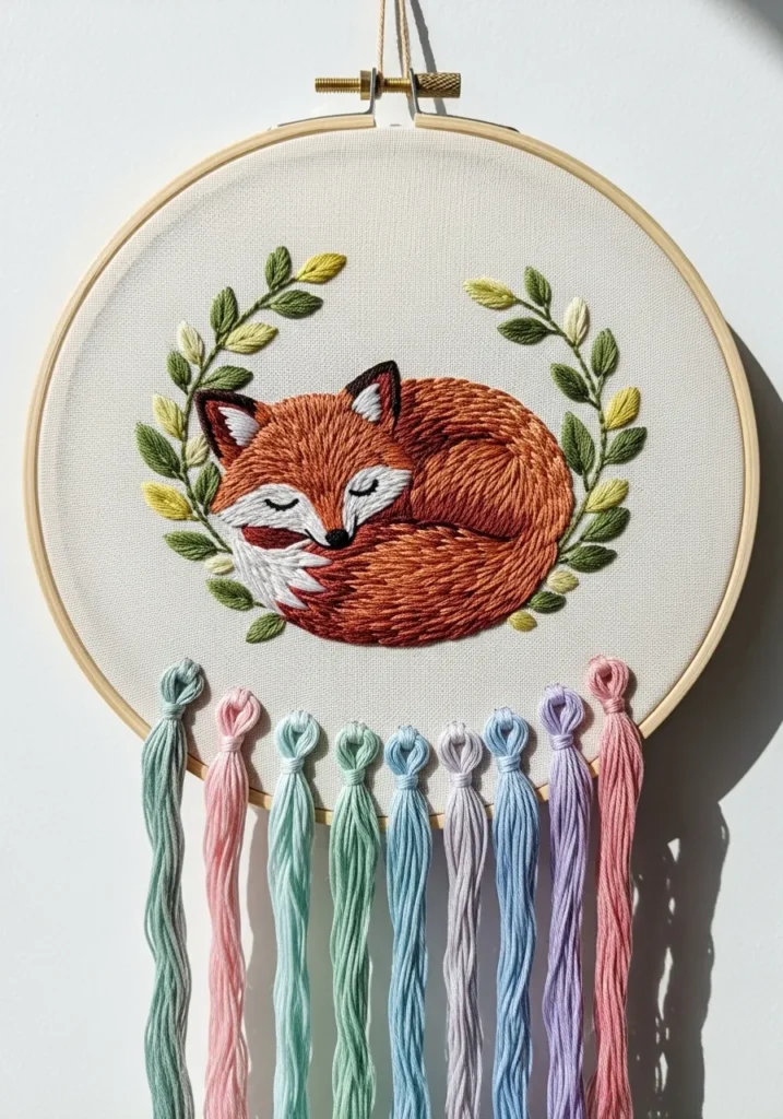 This creative storage piece combines decoration and organization in the prettiest way. A wooden embroidery hoop holds a beautifully stitched sleeping fox surrounded by soft green leaves. Hanging below the hoop are loops of pastel embroidery floss in gentle shades like mint, blush pink, sky blue, and lavender. The threads fall neatly in a row which makes them easy to grab while also looking like part of the artwork.