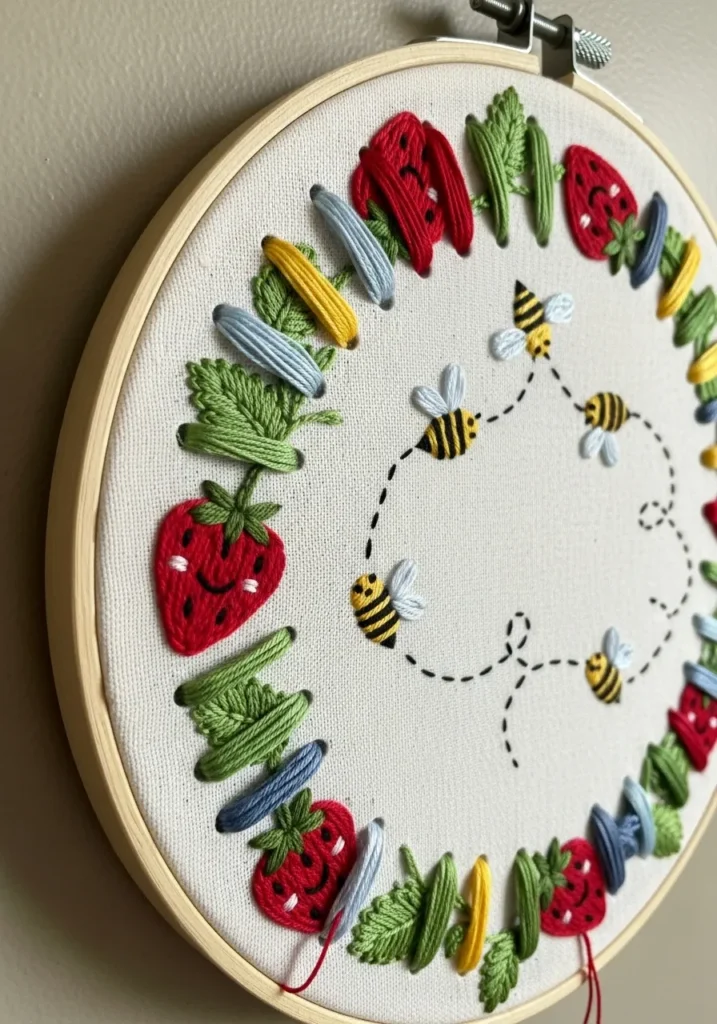 This playful embroidery hoop organizer is decorated with bright stitched garden elements arranged around the edge. Little strawberries, carrots, and leafy vegetables circle the hoop while tiny bees buzz around a stitched path in the center. Bundles of embroidery floss in greens, reds, yellows, and blues are tucked neatly along the border, creating a colorful ring of threads.