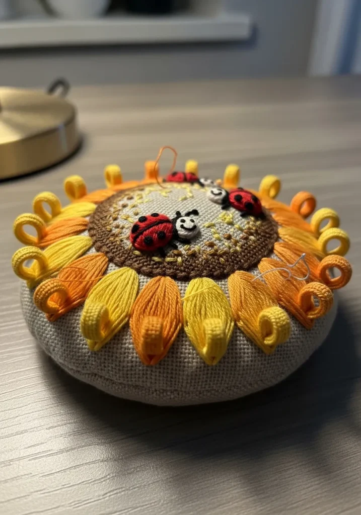 This cheerful pin cushion is shaped like a bright sunflower and instantly adds color to a craft table. The center has a textured brown cushion filled with pins, while the petals are made from small folded pockets that hold embroidery floss. Each petal shows warm tones like golden yellow, deep orange, and soft peach which gives the whole piece a sunny and welcoming look.