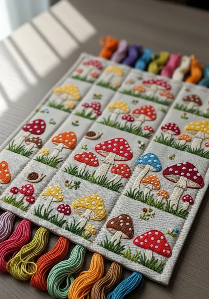 This storage mat looks almost like a tiny embroidered garden. The fabric base is divided into many soft padded squares, each decorated with colorful stitched mushrooms in shades of red, orange, yellow, and blue. Along the edges of the mat, embroidery floss bundles are tucked neatly into small loops so every color stays organized and easy to see.