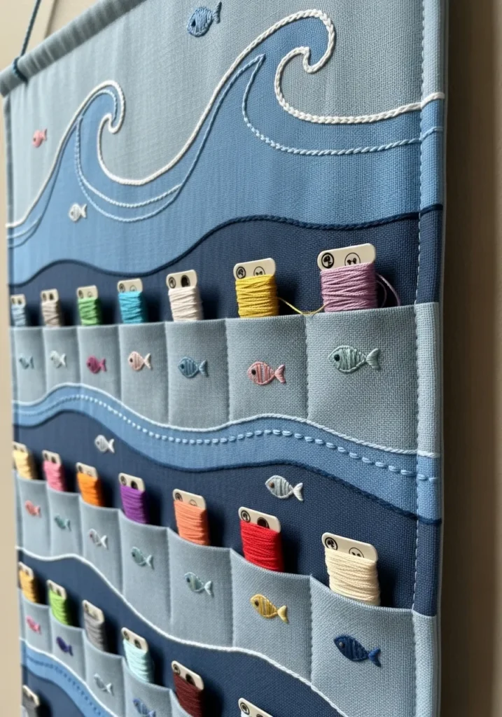This large fabric organizer hangs neatly on the wall and features rows of stitched pockets for embroidery supplies. The soft blue fabric is decorated with embroidered waves and tiny sea themed details which gives it a calm and creative feel. Each pocket holds spools of embroidery floss in different colors, creating a rainbow effect against the fabric background.