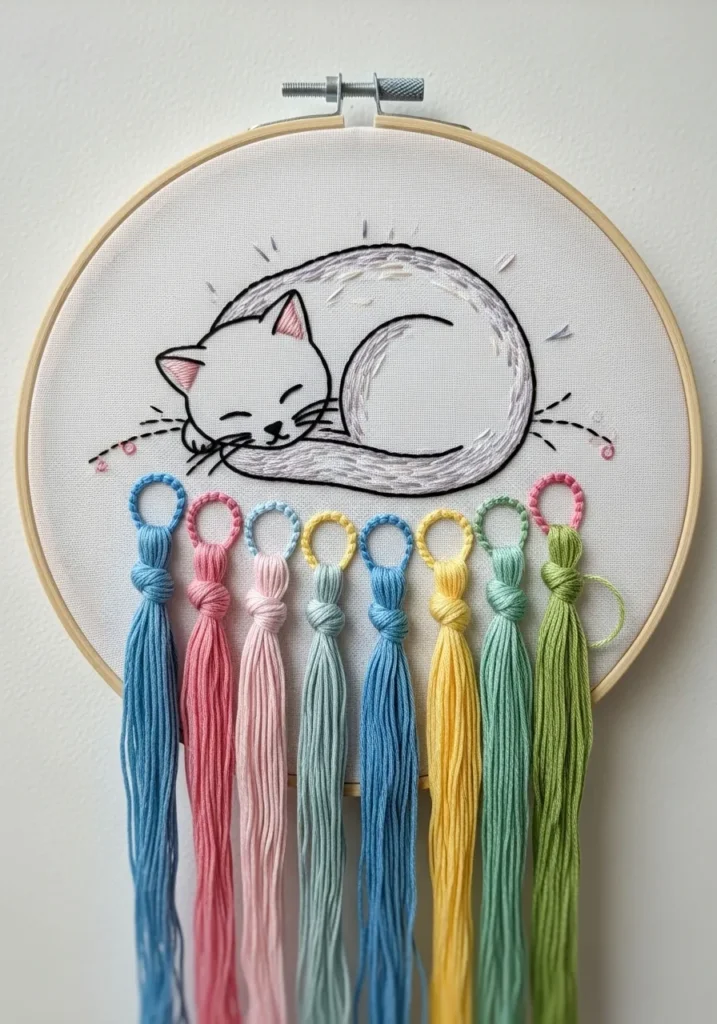 I love projects that mix cute designs with practical storage. Seeing colorful threads hanging under a cozy embroidered cat would make any craft corner feel warmer. It is the kind of handmade piece that feels joyful to create and even better to look at every day.