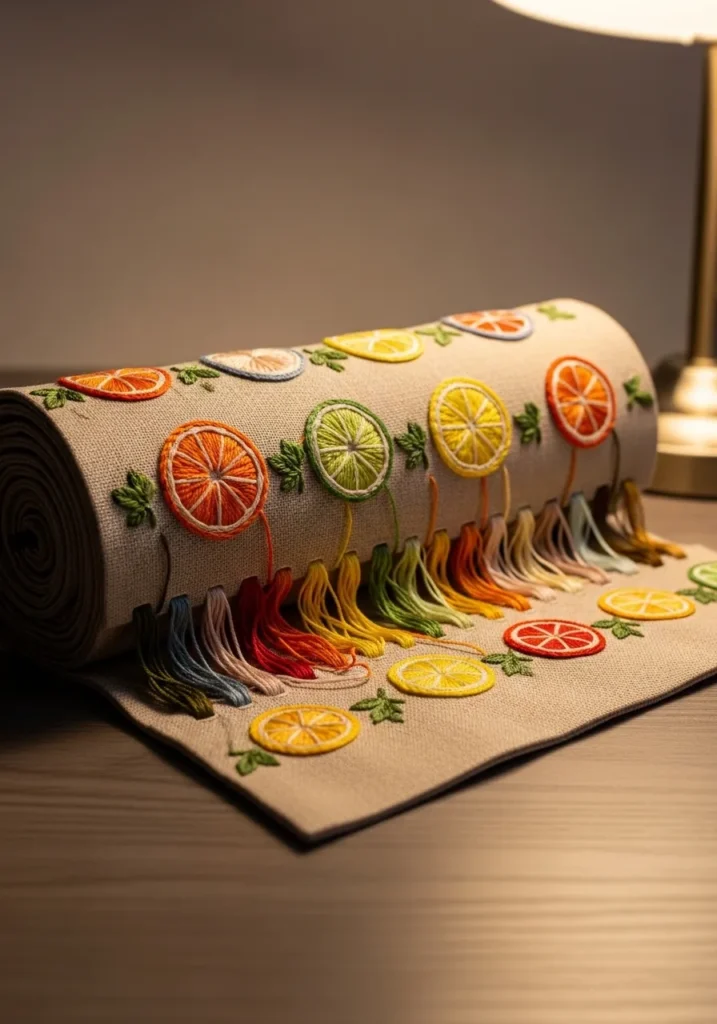 I find roll organizers like this incredibly satisfying because everything stays tidy but still easy to grab. Rolling it up keeps the threads protected, and the citrus theme makes the whole thing feel fresh and fun. It is the kind of project that turns simple storage into a cute craft you actually want to show off.