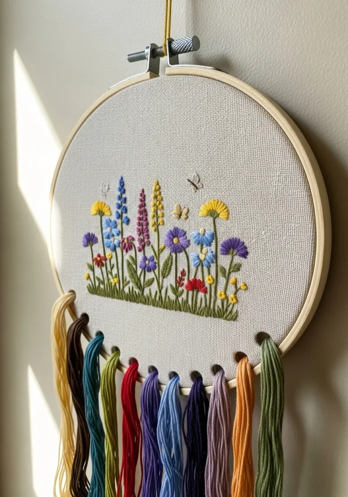 This beautiful embroidery hoop doubles as both wall art and thread storage. The center features delicate embroidered wildflowers in soft colors like lavender, golden yellow, and sky blue stitched onto a natural linen fabric. Hanging neatly below the hoop are strands of embroidery floss arranged in earthy shades that match the flowers above.