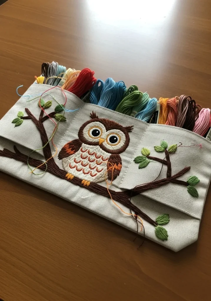 This cozy organizer is made from a soft folded fabric pouch embroidered with sweet woodland details. A charming owl sits in the center surrounded by small trees and leafy branches stitched in earthy greens and browns. Along the top edge, loops hold colorful embroidery floss bundles lined up neatly across the pouch.