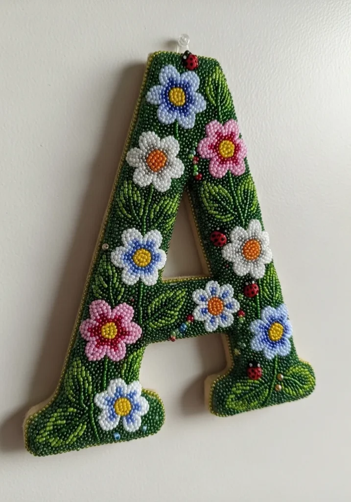 I absolutely adore how cheerful and personalized this piece feels. It turns a simple initial into something that looks straight out of a secret garden. If you’re into adding personality to a nursery, craft room, or gallery wall, this kind of beaded letter is such a fun project to try. You can switch up the flowers to match your favorite colors or even sneak in tiny details that mean something special to you. It feels creative without being intimidating, and the result is bold enough to make people stop and say wow.