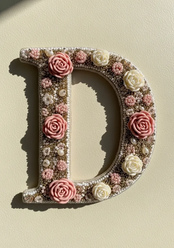 This romantic beaded letter D is covered in a soft mix of ivory, blush, and champagne toned beads that create a delicate textured base. Scattered across the surface are raised resin roses in dusty pink and creamy white, surrounded by tiny pearl beads and shimmering crystals. The combination of smooth pearls, faceted beads, and floral details gives the letter a rich layered look that feels almost heirloom inspired. The edges are neatly outlined with small neutral beads, and you can see subtle variations in bead placement that add to its handcrafted charm.