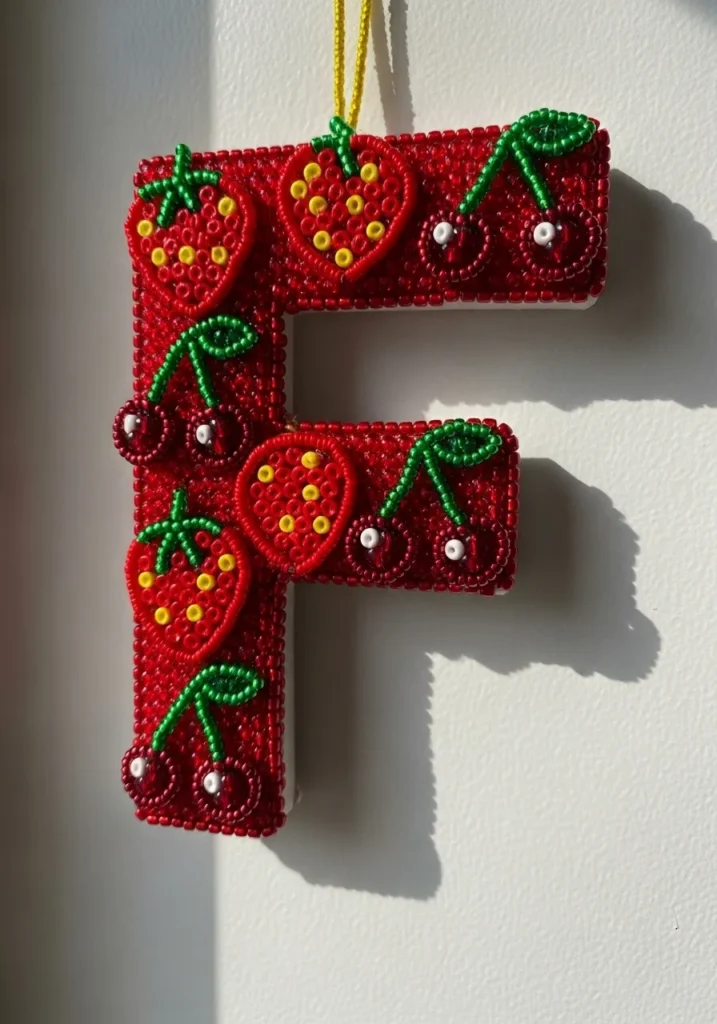 This adorable beaded letter F is covered in vibrant red seed beads that create a bold and juicy background. Scattered across the surface are raised strawberry and cherry designs made from glossy red, green, and tiny yellow beads for the seeds. The strawberries are outlined with neat rows of beads, while the cherries have sweet little white highlights that make them pop. The layered beadwork gives the fruit a slightly puffy look, and you can spot subtle thread details along the edges that add to its handmade charm.