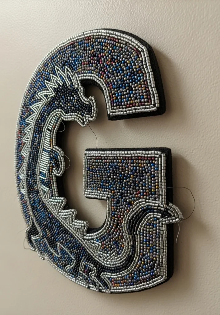 This dramatic beaded letter G features a moody blend of deep navy, charcoal, and steel blue seed beads that create a starry night effect across the surface. Along one side, a detailed dragon silhouette is stitched in layered silver and gray beads, with spiked edges and a curved tail that wraps naturally around the letter’s shape. The dragon’s body stands slightly raised from the background, giving the design a sculpted look. A neat border of metallic beads frames the entire letter, and you can spot tiny variations in bead placement that add authentic handmade character.