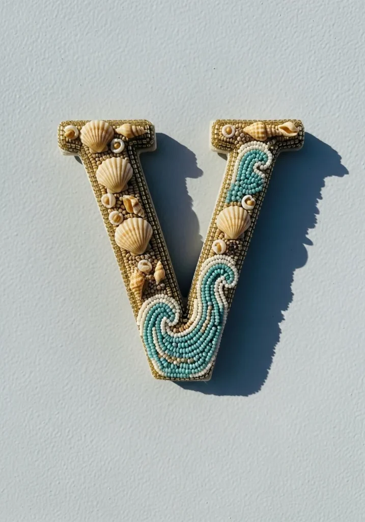 This beach inspired beaded letter V is decorated with sandy toned seed beads that create a warm coastal base. Tiny real shell accents are carefully placed along the surface, including scallop shells and spiral shells that add beautiful natural texture. Soft aqua and white beads form gentle wave patterns along the lower curves of the letter, giving it that ocean breeze feeling. The mix of smooth shells and glossy beads creates lovely contrast, and you can spot slight variations in spacing that make it feel handcrafted and full of character.