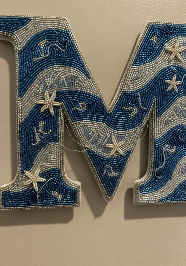 This beautiful beaded letter M is designed with flowing ocean inspired stripes in rich navy blue and soft white seed beads. The wavy pattern moves across the surface like gentle tides, giving the whole piece a sense of motion. Tiny beaded starfish and delicate sea themed details are stitched right into the design, adding texture and dimension. You can see slight thread variations and layered bead placement, which gives it that authentic handmade charm. The glossy beads catch the light in different ways, making the waves shimmer just like water.