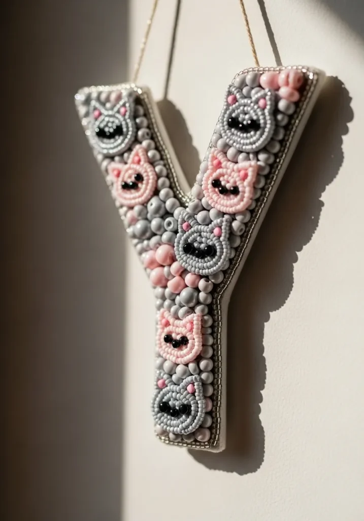 This adorable beaded letter Y is covered in soft gray and blush pink beads arranged into the cutest little cat faces. Each kitty features rounded ears, tiny pink noses, and glossy black bead eyes that give them so much personality. The background is filled with smooth round beads in pale gray, creating a cozy and plush texture. A neat beaded trim outlines the entire letter, and the layered cat designs sit slightly raised, which makes the whole piece feel extra dimensional and playful.