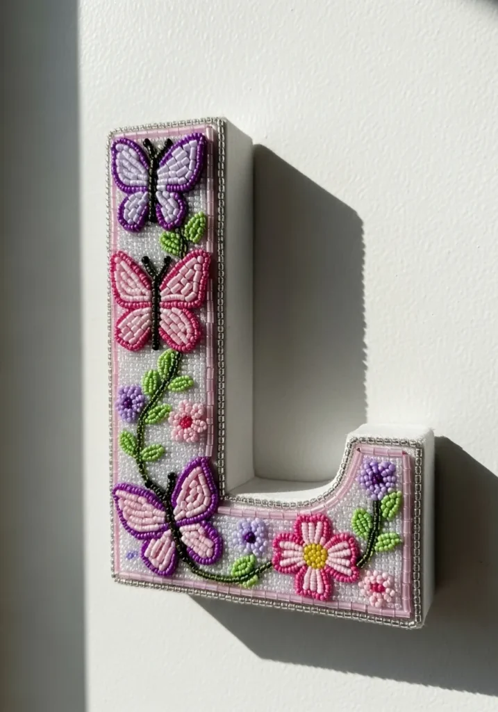 This lovely beaded letter L is covered in tiny pastel seed beads that create a soft pink background with a subtle shimmer. Across the surface, delicate butterflies in shades of lavender and blush pink are stitched in raised beadwork, giving their wings beautiful texture and dimension. Small green beaded vines wind around the letter, dotted with miniature flowers in purple, pink, and sunny yellow. A neat border of silver beads frames the edges, adding a polished finish while still keeping that handmade charm with slight thread variations visible up close.