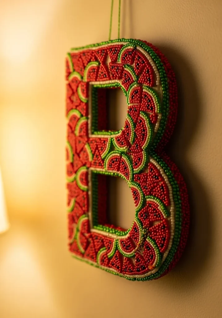 This bold beaded letter B is bursting with juicy summer vibes. The entire surface is covered in tiny red seed beads arranged in curved sections that mimic fresh watermelon slices. Bright green and white bead borders frame each segment, creating that classic rind look, while tiny black bead seeds are scattered across the red for extra detail. The layered beadwork gives the letter a slightly raised texture, and you can spot subtle variations in bead alignment that add to its handmade charm. The glossy beads catch the light beautifully, making the whole piece feel vibrant and playful.