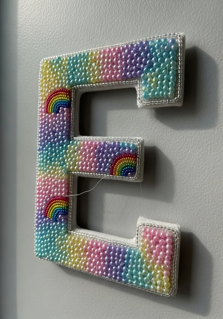 This cheerful beaded letter E is covered in glossy round beads arranged in soft pastel blocks of pink, lavender, mint, baby blue, and buttery yellow. The surface has a slightly raised, bubble like texture thanks to the domed beads, which catch the light in the prettiest way. Tiny rainbow motifs made from bright seed beads are tucked into a few corners, adding playful pops of color against the dreamy background. A neat silver bead trim frames the edges, giving the letter a clean outline while still showing slight thread variations that remind you it is lovingly handmade.