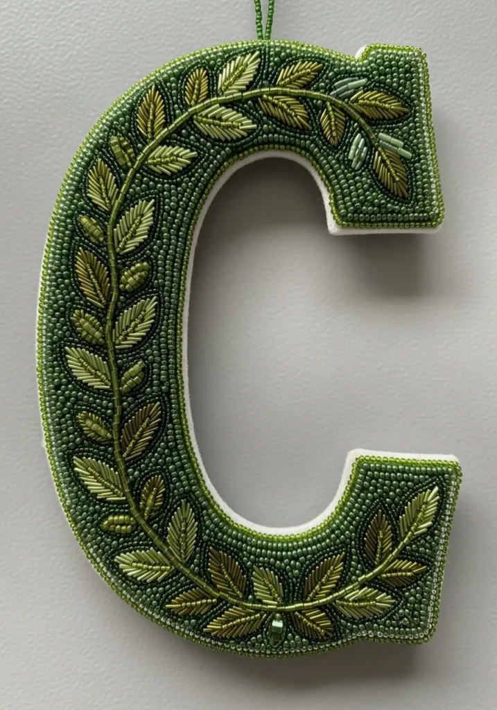 This elegant beaded letter C is wrapped in layers of rich green seed beads that create a deep forest inspired background. Flowing across the surface is a graceful vine made from elongated bugle beads and tiny round beads in different shades of olive, moss, and sage. Each leaf is carefully shaped with layered beads that give it texture and a slightly raised look, almost like real foliage pressed into the letter. The subtle variations in green tones add depth, and you can spot slight thread details near the curves that make it feel beautifully handmade.