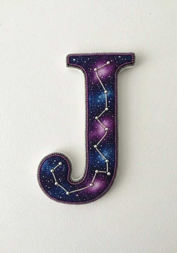 This mesmerizing beaded letter J features a deep galaxy background in rich shades of indigo, violet, and midnight blue. The surface is painted to resemble a star filled sky, speckled with tiny white dots that mimic distant stars. A delicate constellation pattern is formed with small pearl like beads connected by fine beaded lines, creating a raised design that stands out against the cosmic backdrop. The edges are neatly trimmed with tiny purple beads, giving the letter a subtle frame while still showing slight texture variations that highlight its handmade feel.