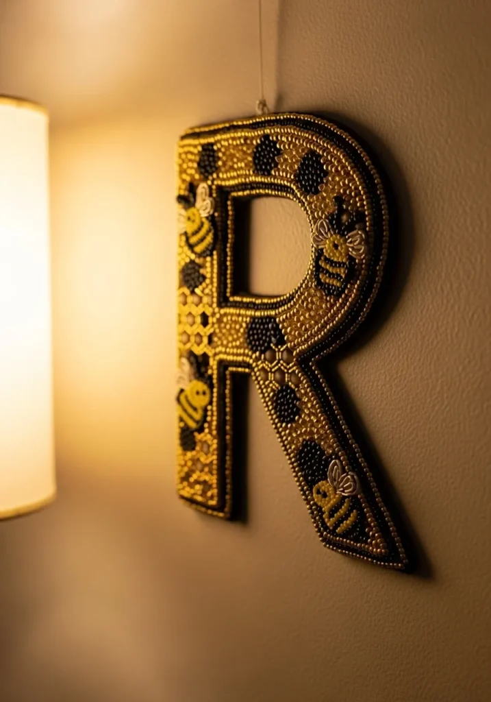 This charming beaded letter R is dressed in warm golden and black seed beads arranged in a playful honeycomb pattern. Tiny hexagon shapes are stitched across the surface, creating a textured background that looks just like a beehive. Sweet little bees made from yellow, white, and black beads are scattered around the letter, with delicate wing details that stand slightly raised from the surface. The outer edge is neatly lined with dark beads for contrast, and the glossy finish gives the whole piece a soft glow under warm light.