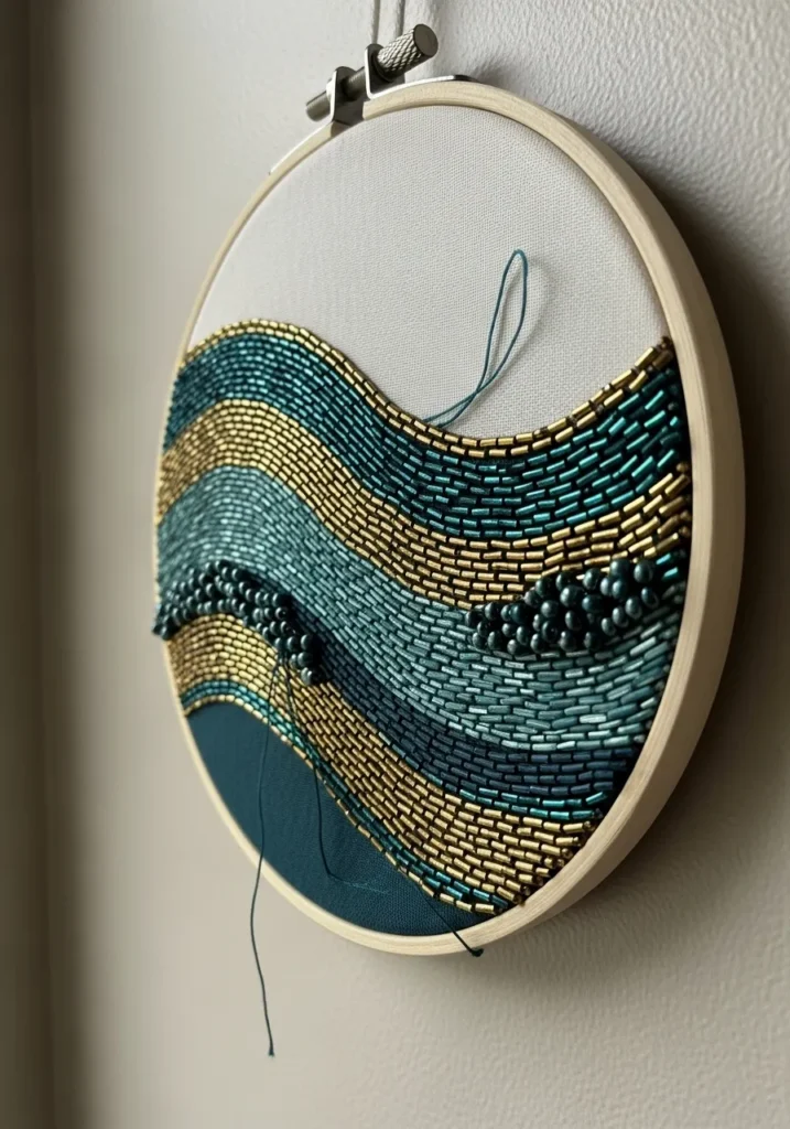I absolutely love how this piece turns simple waves into something so bold and stylish. The mix of colors feels modern and calming at the same time. If you enjoy playing with texture, this kind of layered bead embroidery is such a fun project to try. It looks impressive but it is really just about repeating curved rows and experimenting with bead shapes. I can already imagine this hanging in a cozy craft corner or above a desk for a little splash of ocean inspired magic.