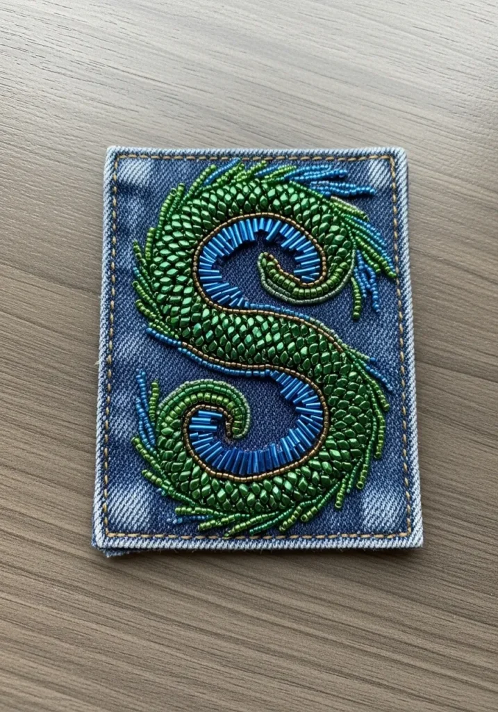 This eye catching denim patch features a large decorative letter formed entirely with textured bead embroidery. The base is classic blue denim with neat stitched borders, giving it that cool handmade patch vibe. The letter itself is built with glossy green beads arranged like tiny scales, creating a rich layered texture. Deep blue bugle beads fill the inner curves, adding contrast and a sleek shine. Small clusters of green and blue beads radiate outward like little bursts of energy, making the design feel dynamic and full of movement.