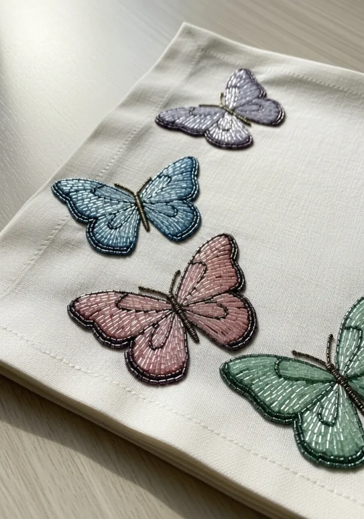 This elegant linen fabric is adorned with delicate butterfly designs created using fine bead embroidery. Each butterfly is filled with tiny seed beads and slim bugle beads arranged in neat rows that follow the curve of the wings. Soft pastel shades of blush pink, dusty blue, sage green, and lavender give the piece a light and airy feel. Darker stitched outlines define the wings and add contrast, while the layered beads create a subtle raised texture that catches the light beautifully against the smooth neutral fabric.