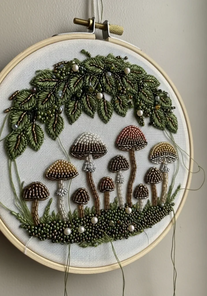This enchanting embroidery hoop captures a tiny forest scene using layered bead embroidery on soft natural fabric. A row of mushrooms in warm browns, creams, and muted reds stands tall, each cap carefully filled with glossy seed beads and slim bugle beads to create a rounded, textured surface. The stems shimmer with lighter beads that give a subtle contrast. Above them, leafy branches arc across the top, stitched with olive and deep green beads arranged like tiny veins. Clusters of small round beads add a dewy, almost magical touch, while the base is packed with earthy green and brown beads that mimic mossy ground.