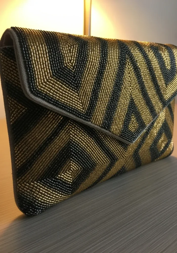 This stunning clutch bag is covered in dense bead embroidery arranged in bold geometric patterns. Rows of metallic gold and deep black beads form sharp chevrons and diamond shapes that repeat across the surface. The beads are stitched tightly together, creating a smooth yet richly textured finish that catches the light from every angle. The structured envelope style flap adds a sleek silhouette, while the intricate beadwork turns the entire bag into a statement piece that feels glamorous and modern.