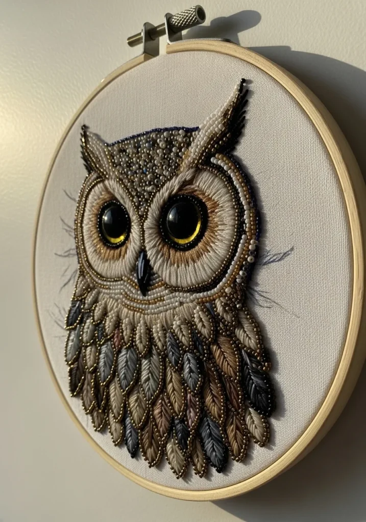 This stunning embroidery hoop features a beautifully detailed owl brought to life with intricate bead embroidery. The owl is stitched onto neutral linen and framed in a simple wooden hoop, which lets the textured design truly shine. Layers of tiny seed beads, metallic accents, and smooth round beads form the feathers in shades of cream, taupe, charcoal, and soft brown. The large glossy eyes instantly draw attention, surrounded by carefully placed beads that create depth and dimension. Each feather is outlined and filled with curved rows of beads, giving the whole piece a rich, sculpted look that feels almost three dimensional.