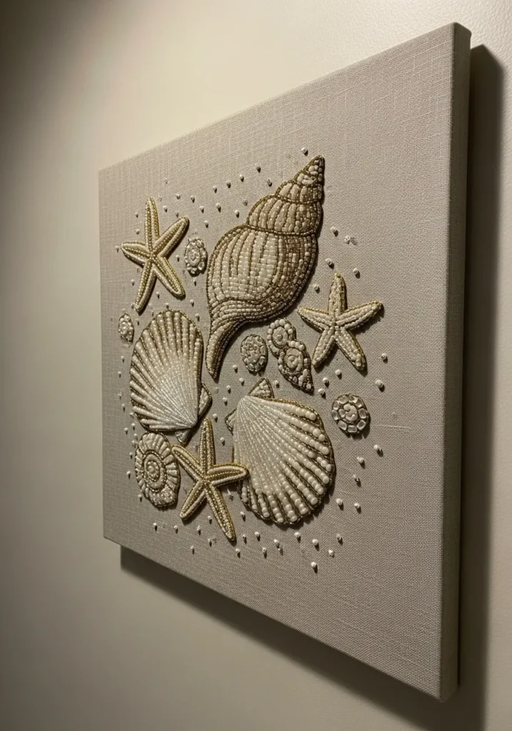 This elegant canvas artwork features a collection of seashells and starfish created entirely with delicate bead embroidery. Set on a neutral linen covered canvas, each shell is carefully outlined and filled with creamy white and soft ivory beads that mimic the natural ridges and curves of real shells. Tiny seed beads are scattered around like grains of sand, adding subtle texture across the background. The layered beads give every shell a gently raised effect, making the whole composition feel refined and beautifully tactile while keeping the color palette calm and cohesive.