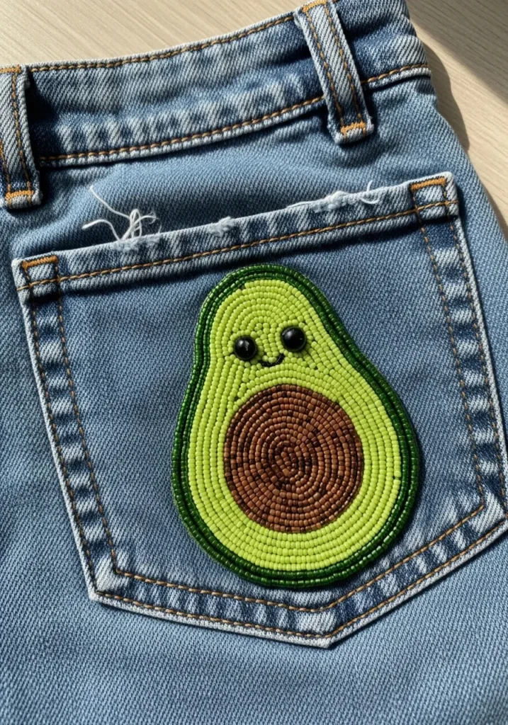 I honestly love how something as simple as a pocket can become this fun. If you enjoy adding personality to your clothes, a beaded patch like this is such a cute weekend project. The rounded shape is easy to follow, and filling it in row by row feels so satisfying. I can totally imagine wearing these jeans and catching a glimpse of that happy avocado every time I turn around. It is a small detail that makes a big smile.