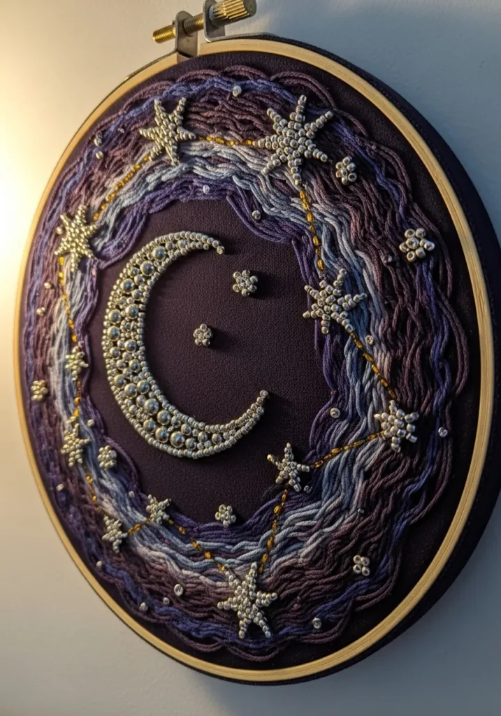This dreamy embroidery hoop features a glowing crescent moon surrounded by a swirling galaxy of textured threads and bead embroidery. The moon itself is carefully filled with silver and pearly beads in different sizes, creating a softly raised surface that mimics craters and gentle curves. Around it, layered strands of purple, blue, and dusky lavender thread form a circular night sky effect, almost like painted waves of stardust. Tiny beaded stars and dotted golden stitch lines connect the constellations, adding sparkle and delicate detail against the deep background fabric.