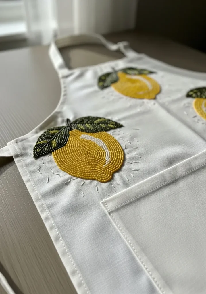 This crisp white apron is brightened with cheerful lemon motifs created in detailed bead embroidery. Each lemon is formed with tightly stitched yellow seed beads arranged in smooth spirals that give the fruit a plump, textured look. A curved highlight in white beads adds dimension, while the leaves are stitched with deep green beads layered to show natural veining. Tiny scattered stitches around the lemons create a subtle sparkle effect, almost like little drops of citrus zest. The clean white fabric makes the vibrant yellow and green tones pop beautifully.