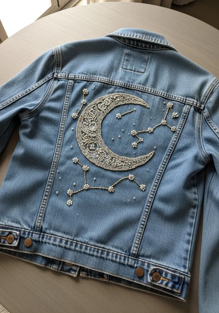 I love how this kind of bead embroidery turns a simple jacket into something that feels completely personal. It looks detailed and impressive, but the design is actually built from repeating shapes and small bead clusters, which makes it very doable if you take your time. If you are into celestial themes, this is such a fun way to show your style without saying a word. I can already picture wearing this on a cool evening and feeling like I wrapped myself in a little piece of the night sky.
