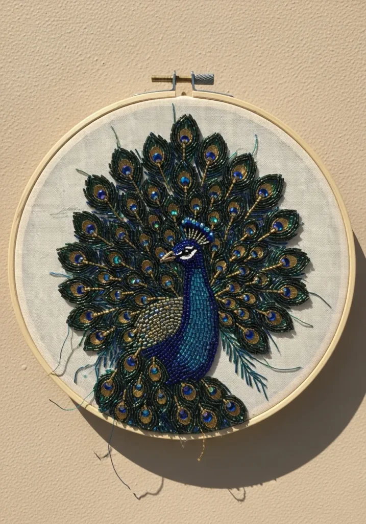 This breathtaking embroidery hoop showcases a majestic peacock created with rich bead embroidery on soft neutral fabric. The body shimmers in deep sapphire and teal beads arranged in neat rows that follow the curve of the bird. Each feather in the dramatic fan tail is layered with green, blue, and gold beads, forming eye catching patterns with tiny circular centers. The beads are stitched densely to create a full textured surface, while delicate thread accents add movement and softness around the edges. Framed in a simple wooden hoop, the vibrant design truly takes center stage.