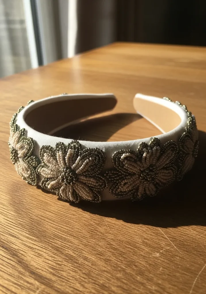 This stunning headband features soft ivory fabric wrapped around a structured band, topped with beautifully layered floral bead embroidery. Each flower is crafted from tiny seed beads in creamy white and muted gold tones, arranged petal by petal to create a rich textured bloom. The beads are stitched closely together, giving the flowers a dimensional look that gently catches the light. Subtle outlines in darker metallic beads add definition and depth, making the design feel refined and cohesive. The overall palette is neutral and timeless, perfect for weddings, brunches, or simply elevating an everyday outfit.
