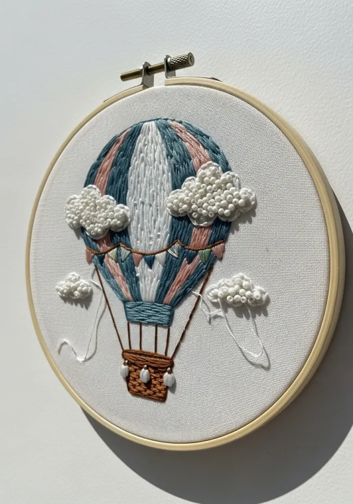 This charming embroidery hoop features a dreamy hot air balloon stitched on crisp white fabric and framed in a light wooden hoop. The balloon is created with soft embroidery floss in shades of teal, blush pink, and white, arranged in vertical panels for a gentle striped look. Puffy clouds made from clustered white beads add a raised textured effect that almost looks like tiny marshmallows. The basket is stitched in warm brown thread with delicate lines connecting it to the balloon, giving the whole design a sweet storybook feel.
