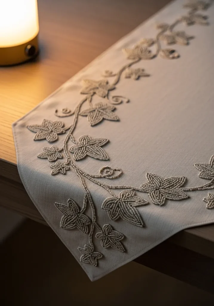 This beautiful table runner features delicate floral vines stitched with tiny ivory and soft champagne seed beads on a neutral linen fabric. The design flows gracefully along the edge, with leaves and blossoms carefully outlined and filled to create subtle raised texture. Each petal is formed with closely placed beads that catch the light in the most understated way. The vines curve gently across the fabric, giving the whole piece a refined and romantic feel. The monochrome palette keeps it timeless while the beaded details add just enough sparkle to feel special.