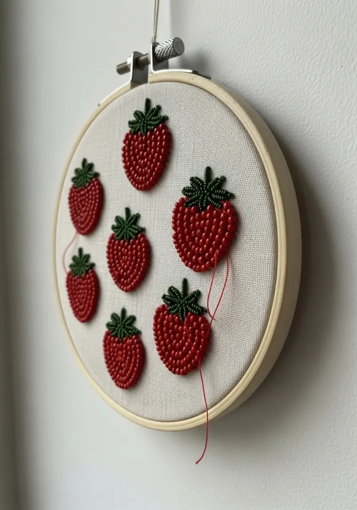 I cannot get over how cheerful this piece feels. It is playful, colorful, and just the right amount of quirky. If you love food inspired designs, this is such a fun bead embroidery project to try because the shapes are simple and easy to repeat. I like that you can focus on filling each strawberry with beads and watch the texture build up row by row. It feels almost like decorating tiny candy pieces, and the finished result is adorable enough to brighten any wall.
