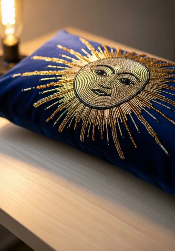 I adore how this design feels both cozy and bold at the same time. If you are into celestial themes but want something a little glamorous, this kind of bead embroidery is such a fun project to try. The face can be stitched slowly row by row, which is oddly relaxing, and adding the rays feels like decorating your own little sunshine. I can totally see this as a statement pillow on a sofa or reading chair, adding that perfect touch of sparkle without feeling over the top.