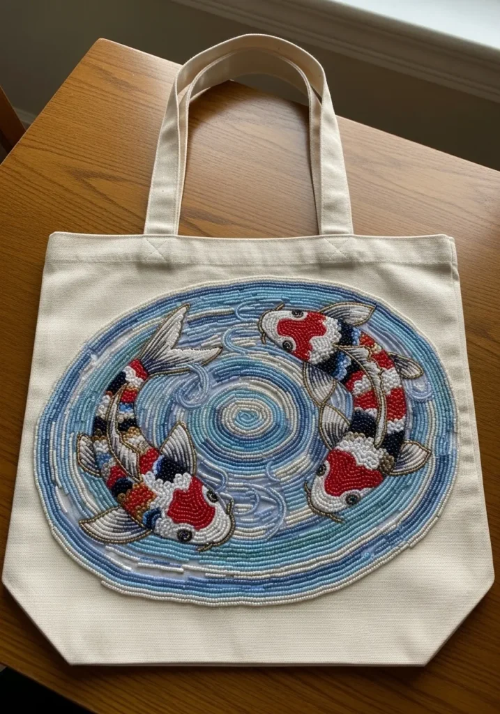 This natural canvas tote bag is transformed with a bold circular bead embroidery design featuring three vibrant koi fish swimming in a swirling pool of blue. The water is stitched in layered rows of light and deep blue beads that create a rippling spiral texture, almost like you can see the current moving. Each koi is detailed with glossy red, white, navy, and metallic beads that form raised scales and flowing fins. Fine stitched outlines define their shapes, while the dense beadwork gives the whole centerpiece a rich, dimensional feel against the simple cream fabric.