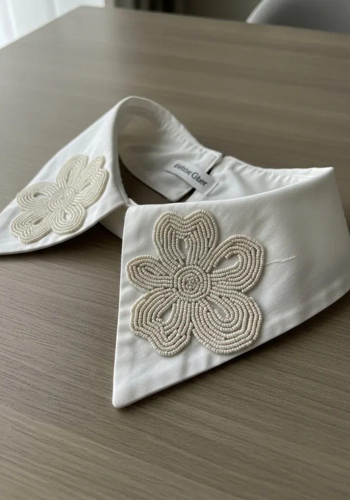 This crisp white statement collar is elevated with a beautifully detailed floral bead embroidery design stitched in matching ivory seed beads. The flower sits prominently on the pointed front, built from tightly curved rows of tiny beads that create a soft sculpted texture. Each petal is outlined and filled with concentric bead lines, giving the design depth without adding color contrast. The smooth fabric base keeps the look clean and modern, while the raised beadwork adds just enough dimension to make it feel special and refined.